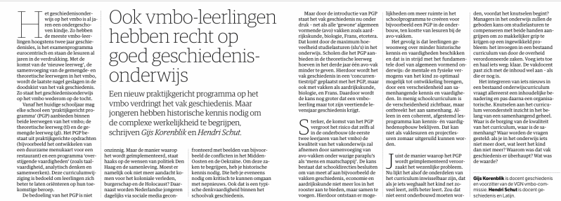 Samen met mijn collega Hendri Schut (docent geschiedenis en Latijn) hebben wij een stuk geschreven over de gevaren van de implementatie van het Praktijkgericht programma (PGP) op de mavo. Het PGP is namelijk een bedreiging voor toekomst en kwaliteit van het vak geschiedenis.