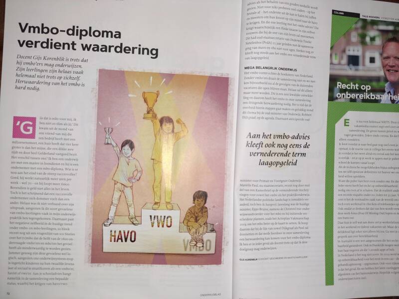 Voor een artikel over de uitdagingen van het werken in het onderwijs werden verscheidene docenten in heel Nederland door Marieke Sjerps geïnterviewd. Ook ik mocht een bescheiden bijdrage in het artikel leveren. Het stuk bevat bijvoorbeeld een uitleg en werkwijze van mijn werkvorm 'Blind Bekennen' voor het voeren van moeilijke gesprekken met leerlingen. Daarbij mocht ik mijn mening over het onderwijs geven.